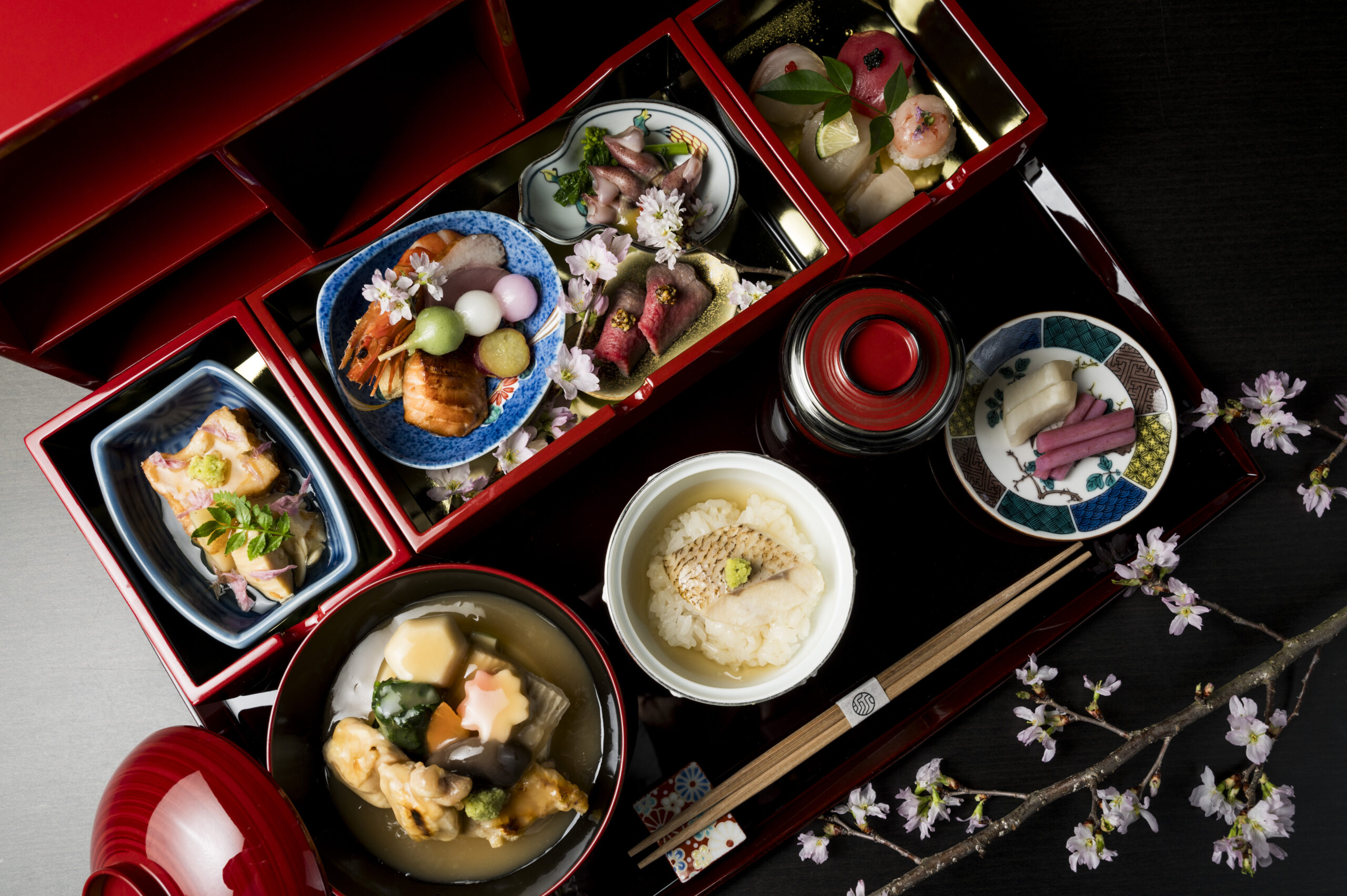 朱塗りの美しい箱はかつての御殿様の園遊弁当をイメージしました。加賀てまりをイメージした手まり寿司や、上質な脂身がのった高級魚・のど黒の蒸し寿司は最上級の美味しさです。美しく咲き誇る桜と金沢城の絶景、季節の素材をちりばめたメニューとともに優雅なひと時をお過ごしください。