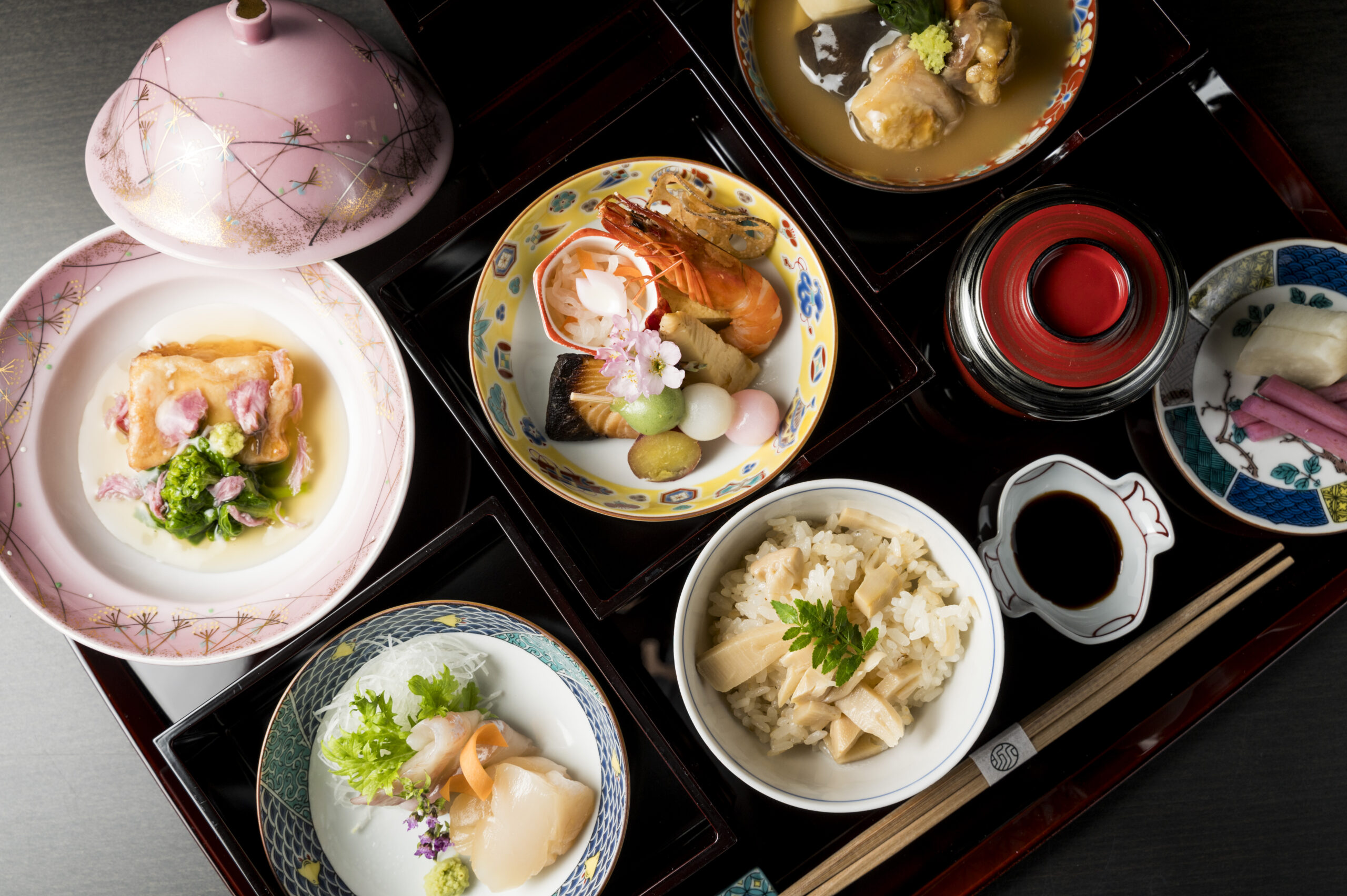 A very popular cherry-blossom-viewing lunch every year. Enjoy some of the finest Kanazawa has to offer, including temari sushi reminiscent of elaborately colorful Kaga Temari balls, and mushi-sushi steamed sushi topped with deliciously fatty blackthroat seaperch. Experience the ultimate in luxury: enjoy a meal with a view of the beautiful cherry blossom.