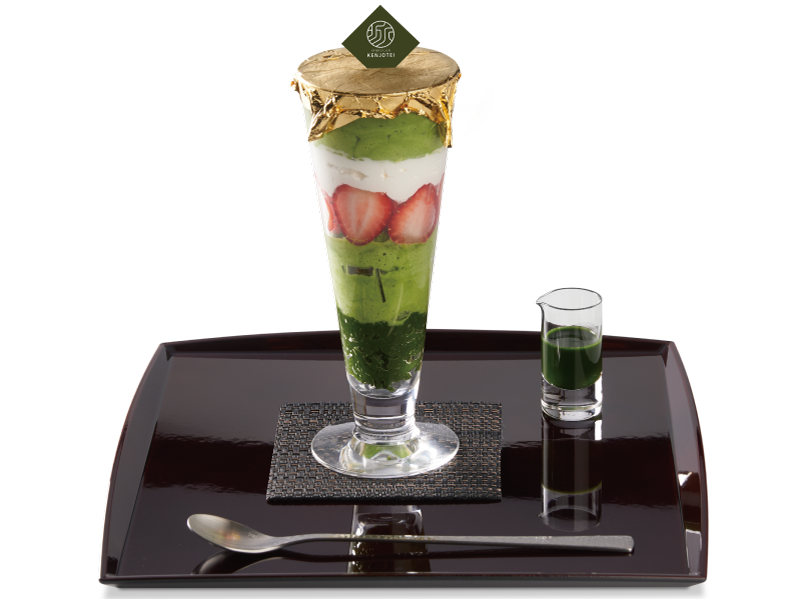 Enjoy the harmony of Kaga Bocha roasted tea kanten jelly, premium handmade sweet bean paste, chewy shiratama dumplings, rich matcha green tea ice cream, sherbet, and espuma foam, all topped with a sheet of gold leaf for an especially luxurious feel.
