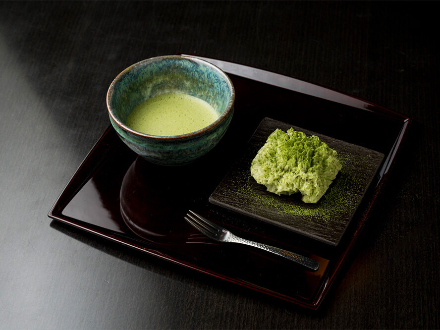 Enjoy high-quality matcha green tea from Nodaya Tea, served alongside a nama-rakugan pressed confection produced in collaboration with the local sweets maker Moroeya.